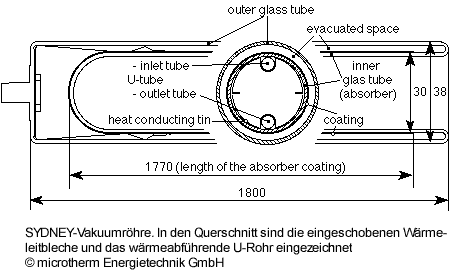 Die Vakuum-Röhre besteht aus zwei ineinander geschobenen Glasröhren, deren Enden wie bei einer Thermoskanne an einer Seite miteinander verschmolzen sind. Der Spalt zwischen den Glasröhren ist vakuumisoliert, es treten daher kaum Wärmeverluste an die Umgebung auf. Vom Absorber, der inneren Röhre, wird die Wärme durch das Glas über ein Wärmeleitblech auf ein U-förmiges Rohr übertragen, das vom Wärmeträger durchflossen wird. Bild Sydney-Röhre | |