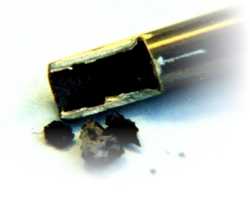 Bei ungeeigneten Frostschutzmitteln kann es neben der Versauerung sogar zur Belagbildung bis zur Verstopfung der Rohrleitungen kommen. Teure Reparaturen sind die Folge. Auf dem Bild sind deutlich die Ablagerungen an der Rohrwandung zu erkennen. Im Vordergrund ist durch das Auftrennen herausgebrochenes verkohltes Glykol zu sehen.